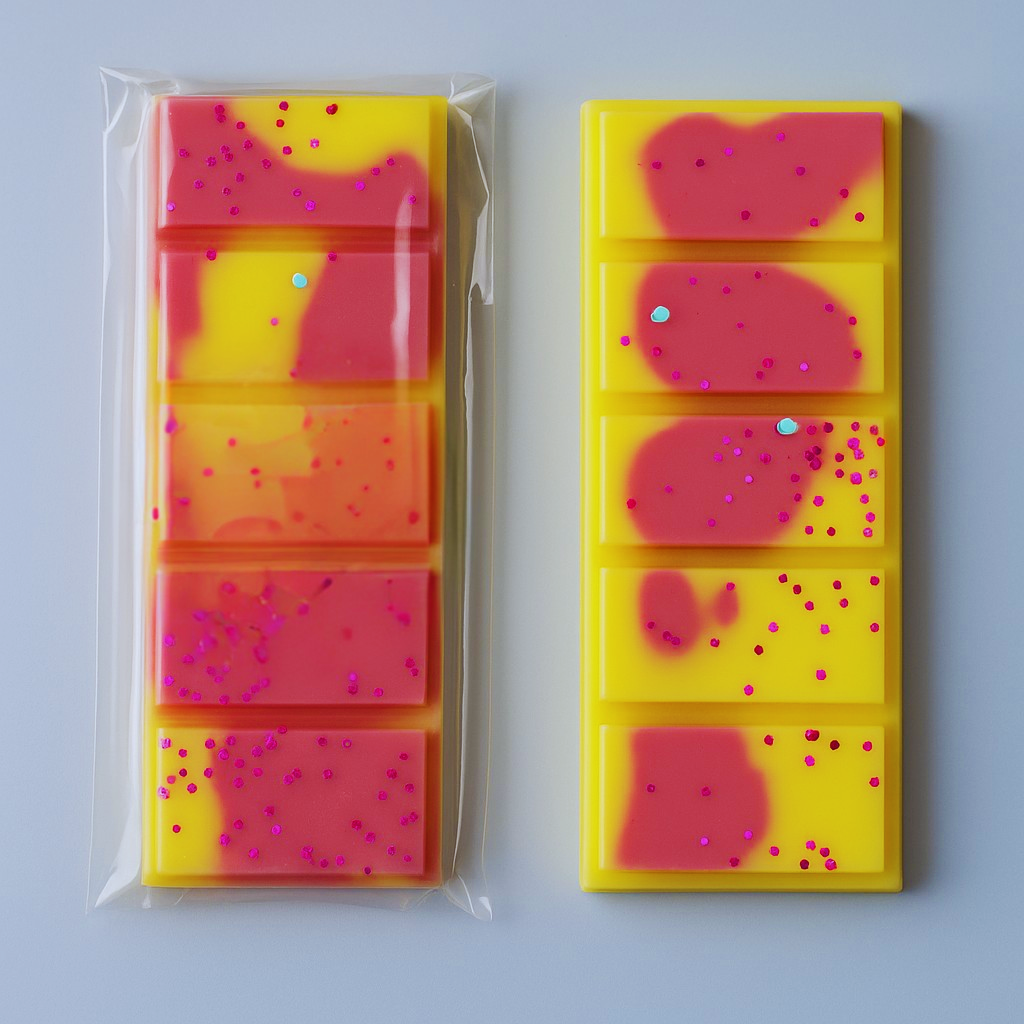 Elaboradas a mano con cera de soja 100 % natural y vegana 🌿, cada tableta presenta un diseño único en tonos amarillo y morados con destellos de purpurina brillante ✨ que reflejan la dulzura de su aroma.